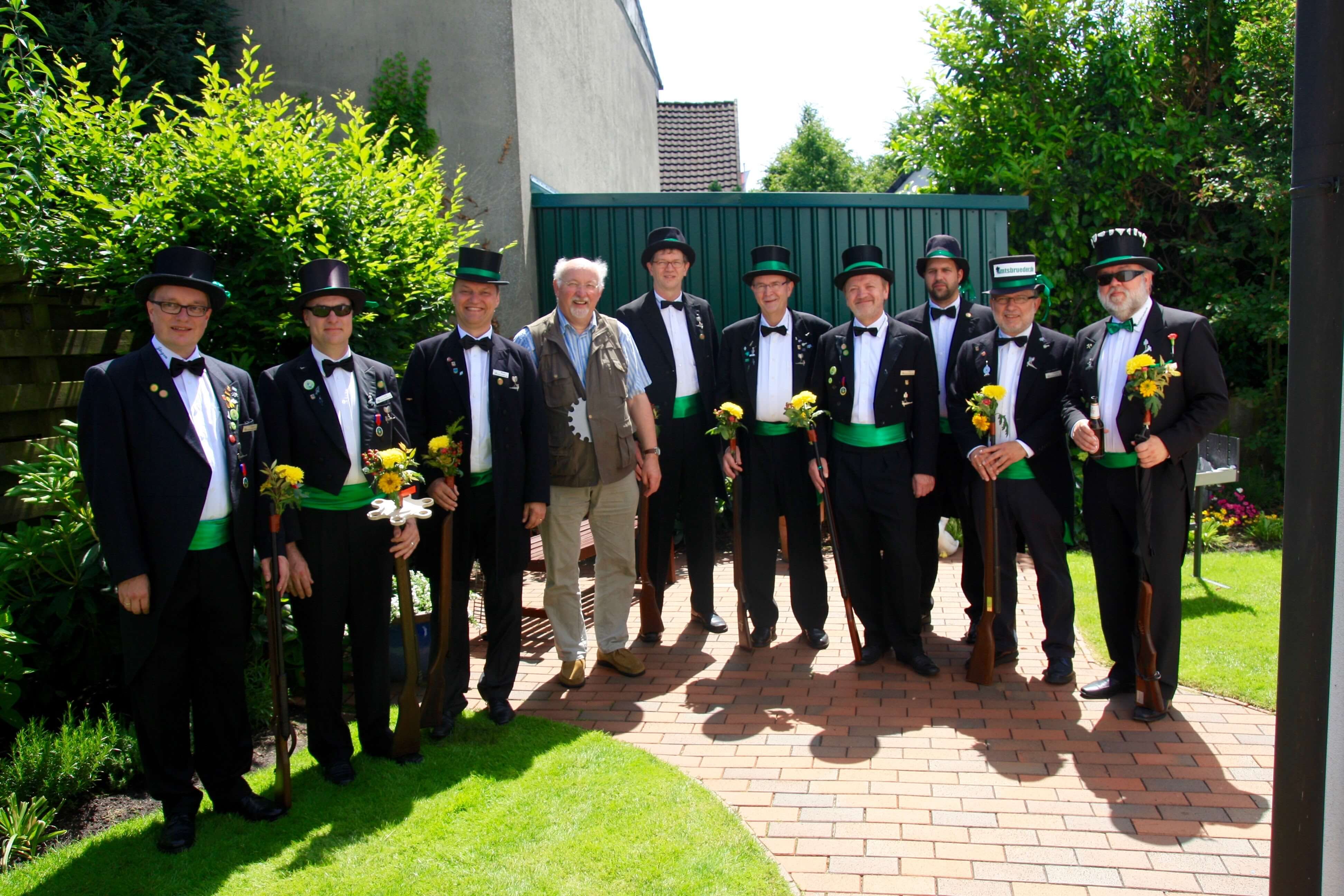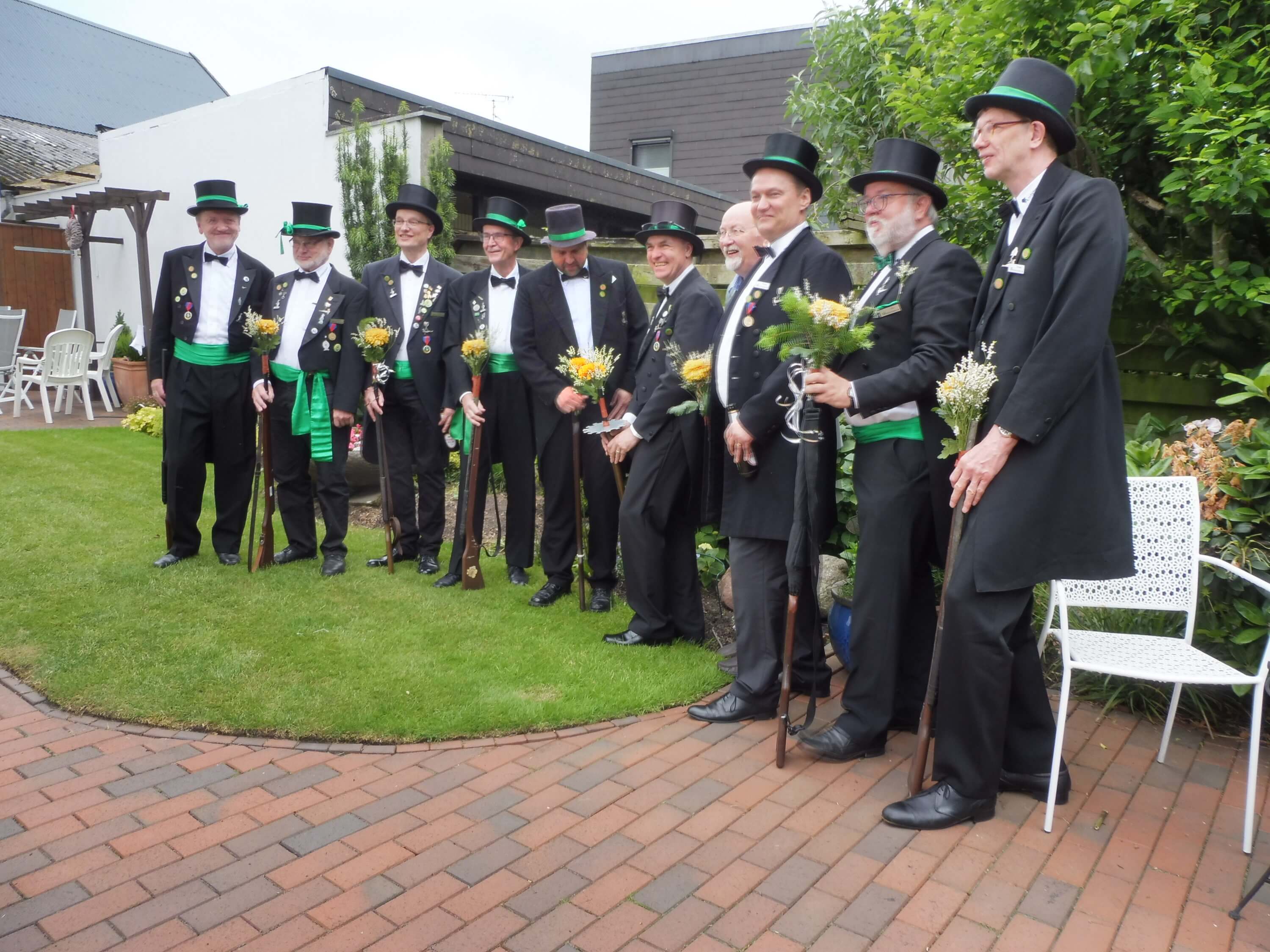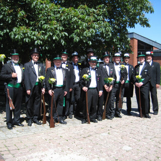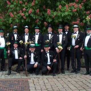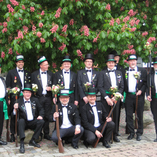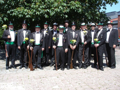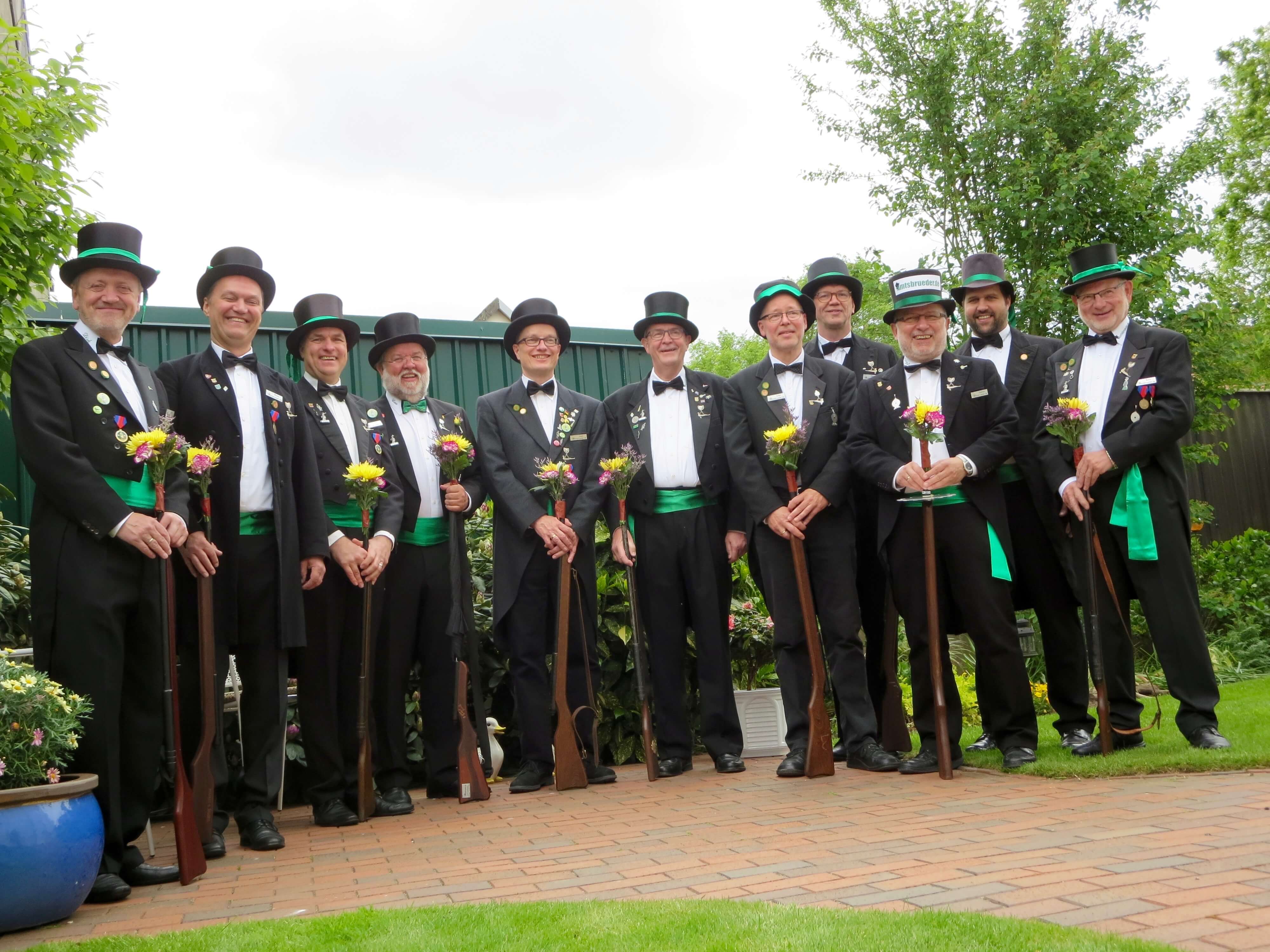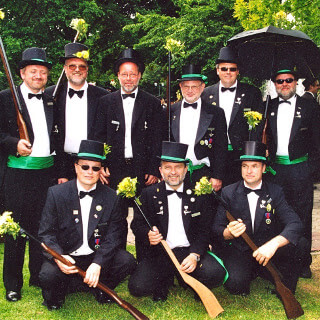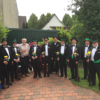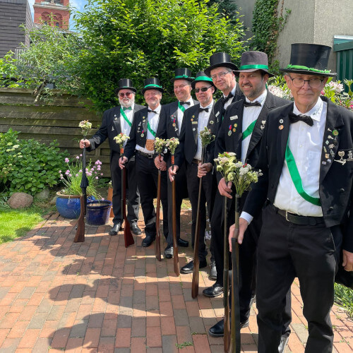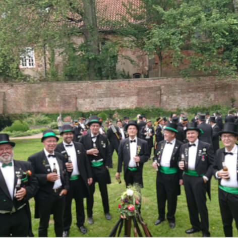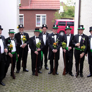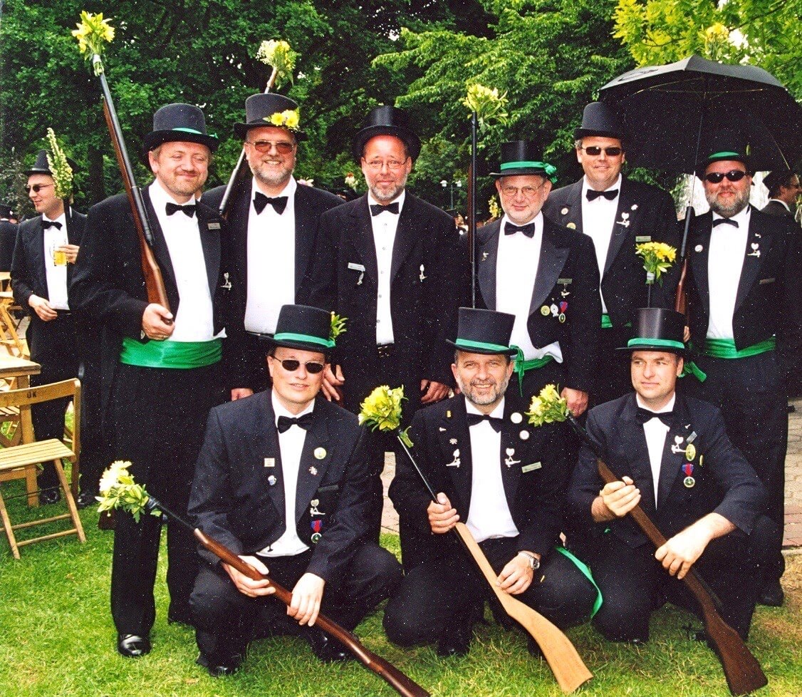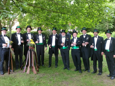 Ursprünglich sind wir eine Gruppe Gildemitglieder aus dem Kreishaus des Landkreises Oldenburg in Wildeshausen, die sich zusammengeschlossen haben, um am Pfingstdienstag mit der Kompanie auszumarschieren. Unser Erkennungszeichen ist das grüne Band am Zylinder.