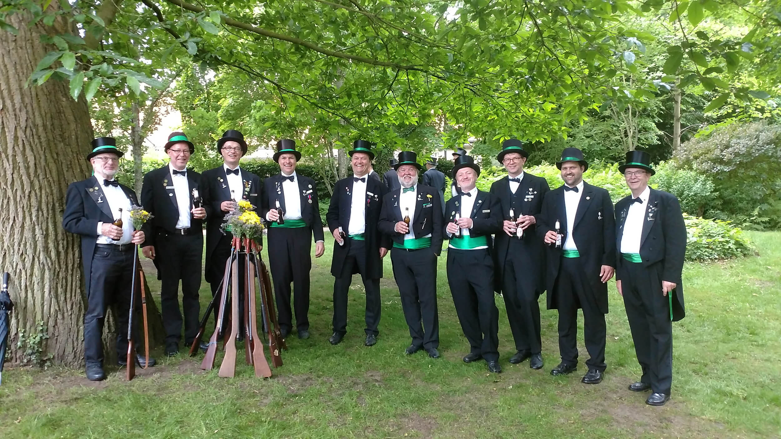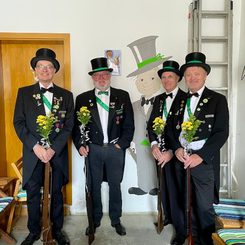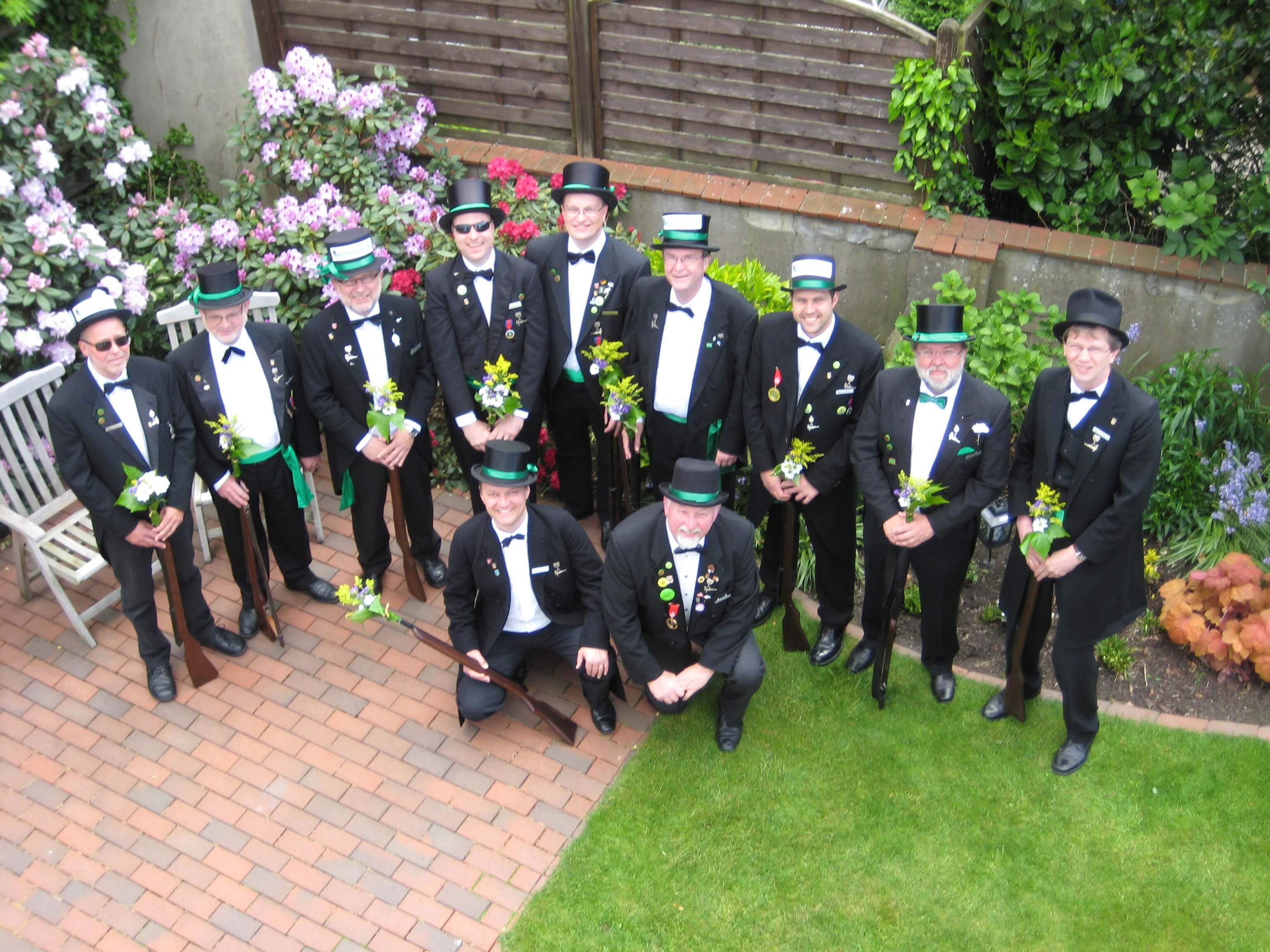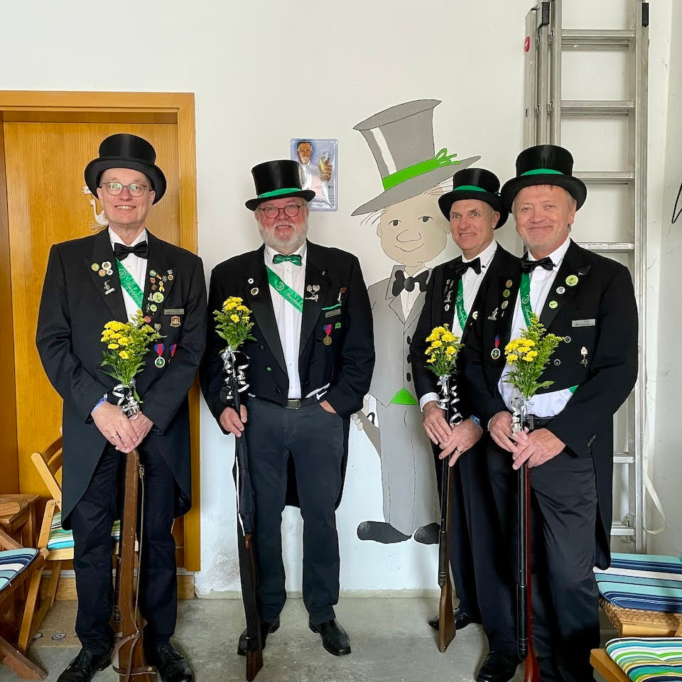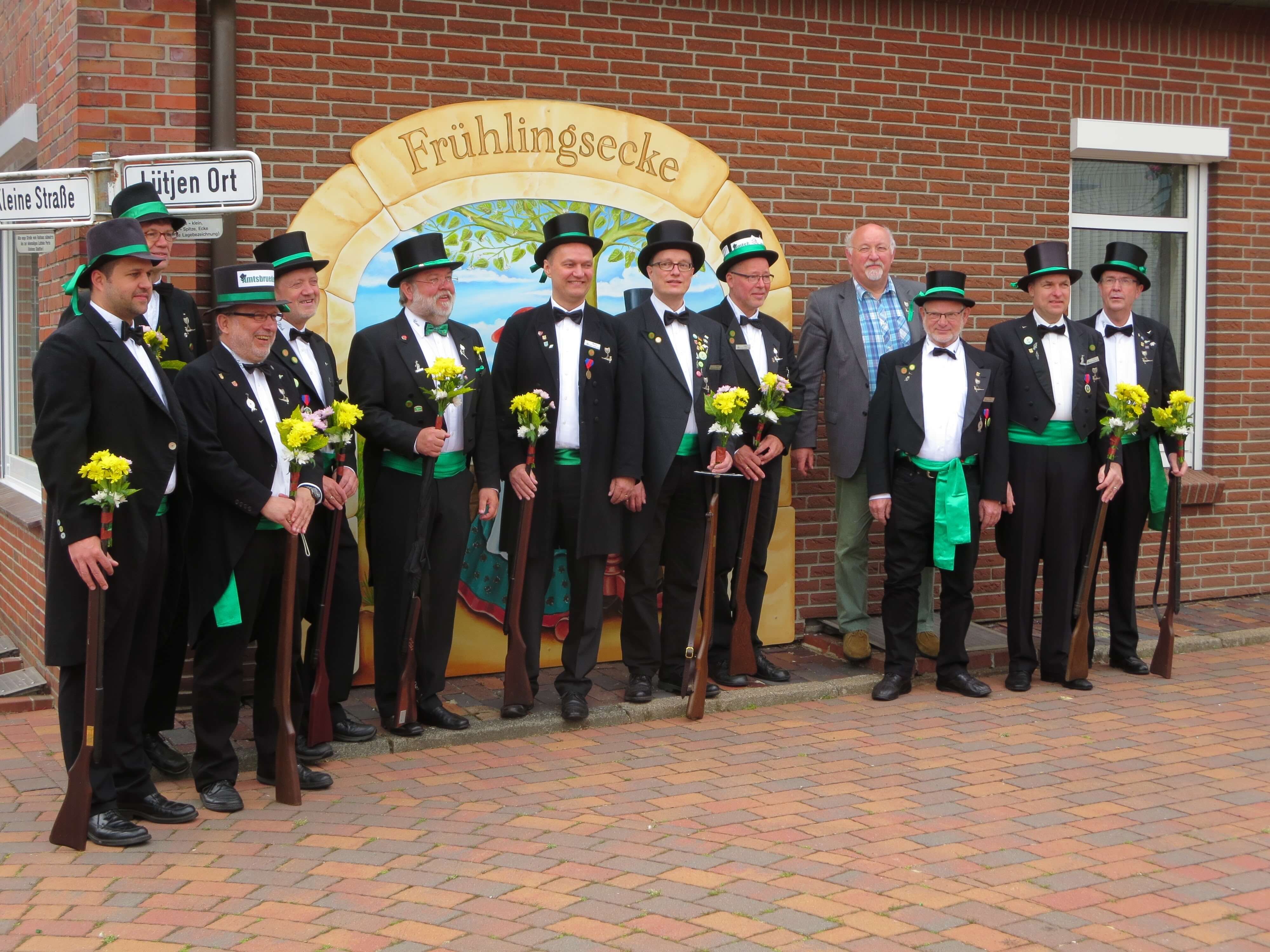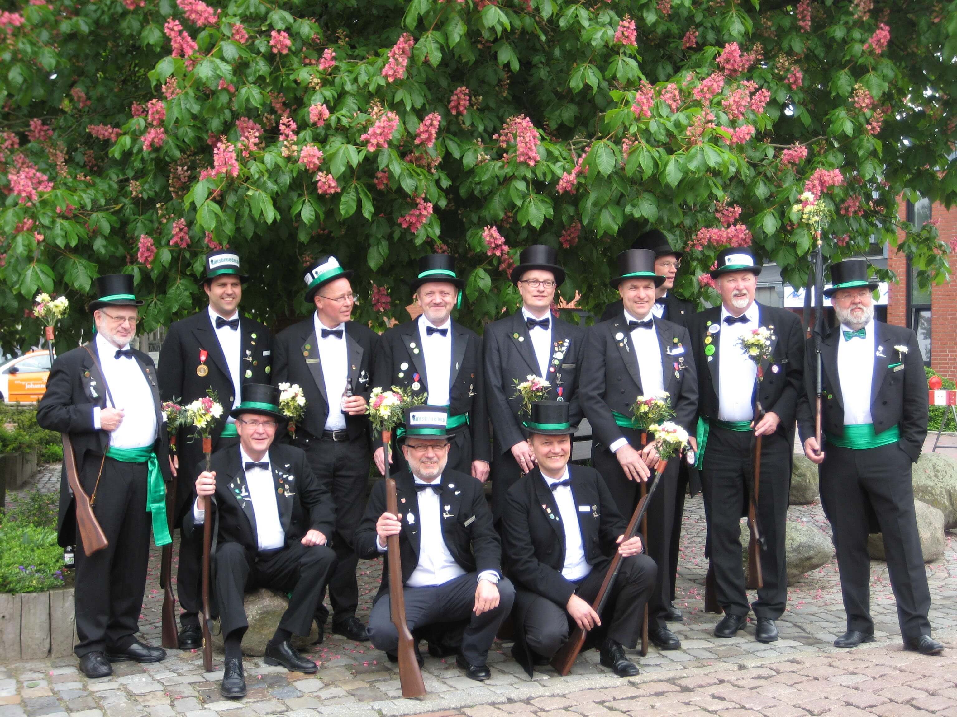 Ursprünglich sind wir eine Gruppe Gildemitglieder aus dem Kreishaus des Landkreises Oldenburg in Wildeshausen, die sich zusammengeschlossen haben, um am Pfingstdienstag mit der Kompanie auszumarschieren. Unser Erkennungszeichen ist das grüne Band am Zylinder.