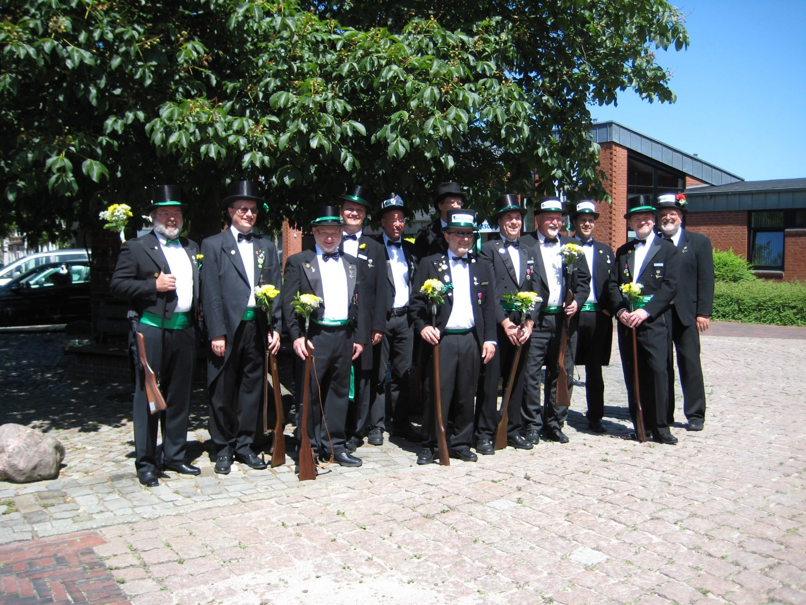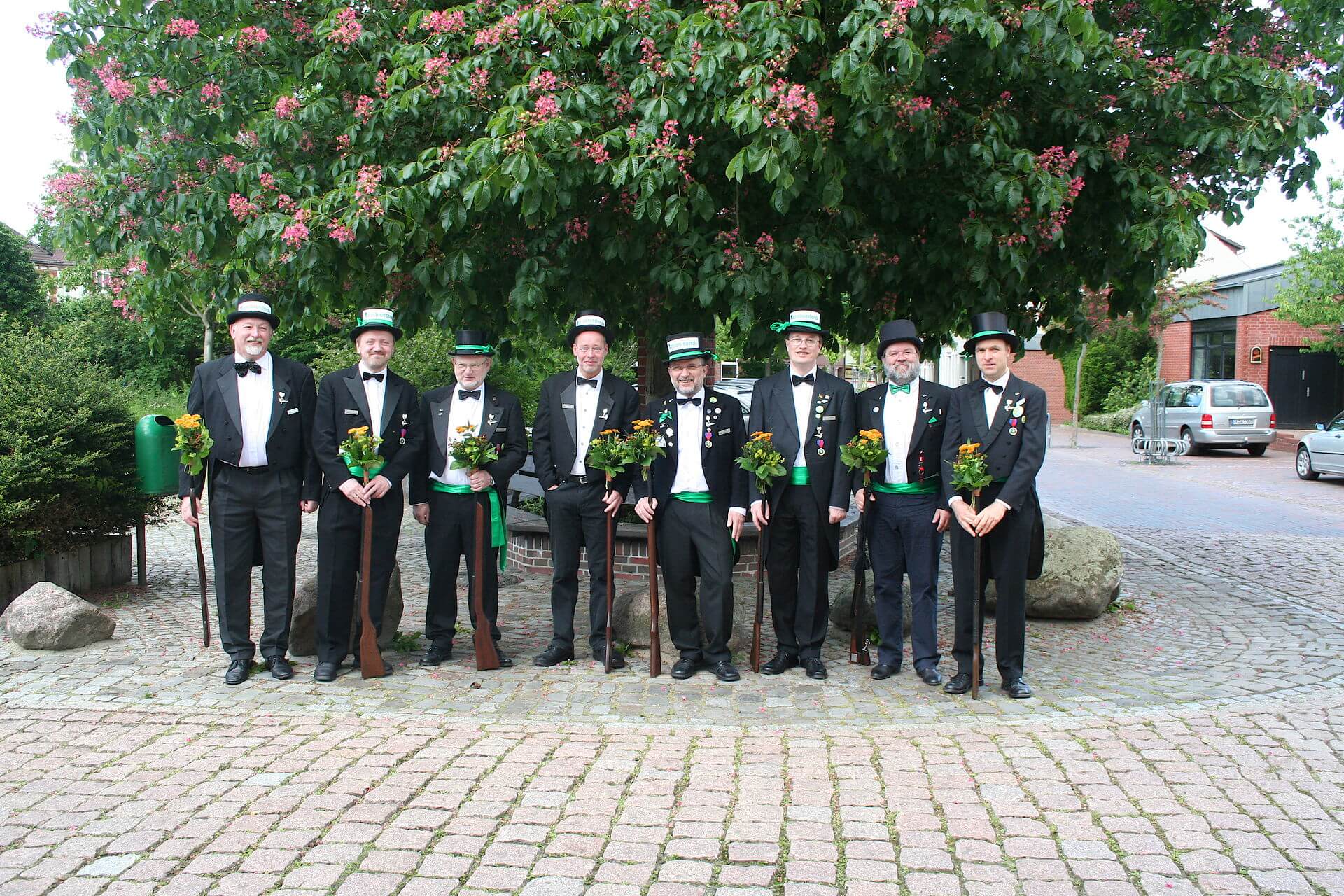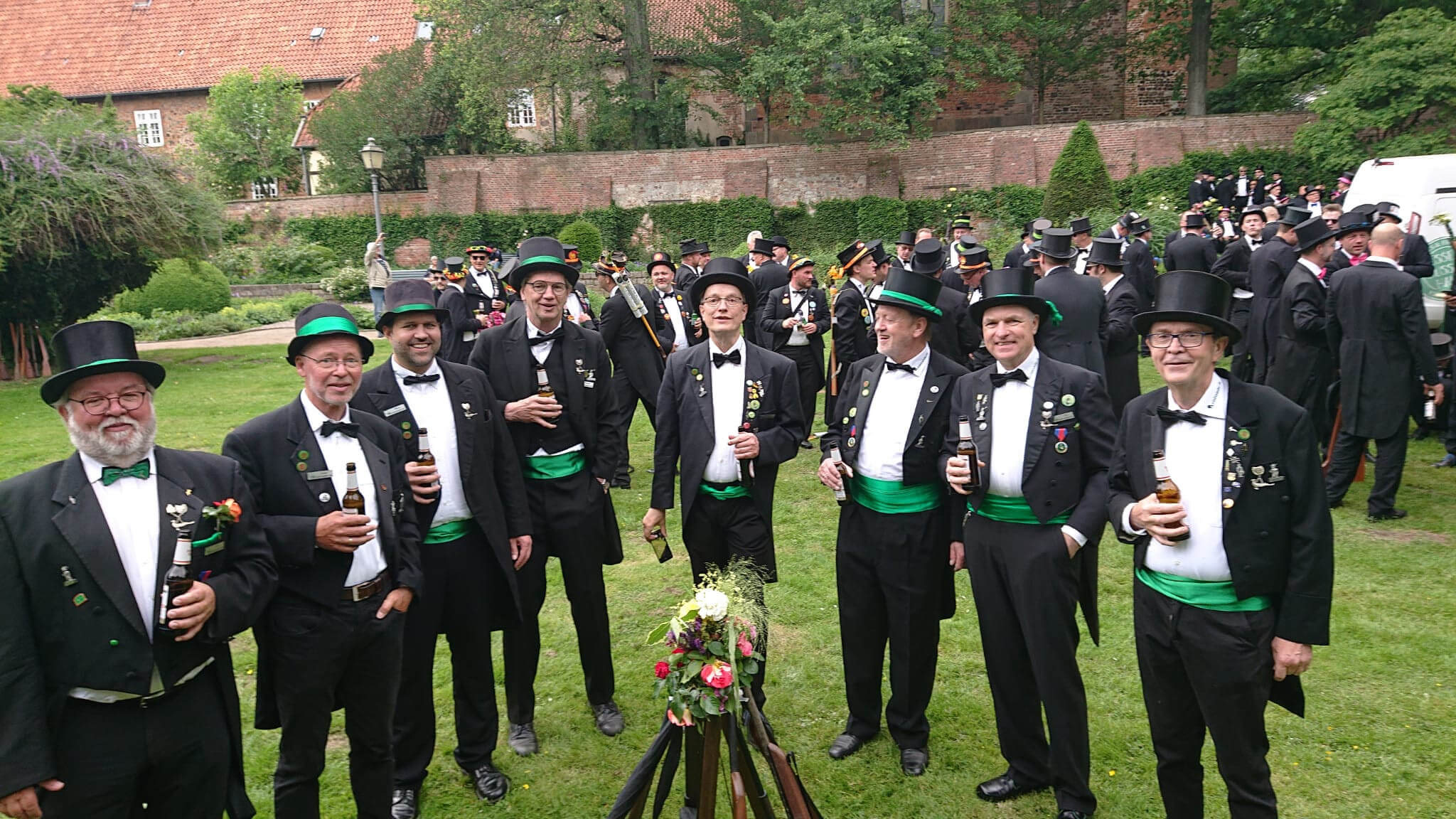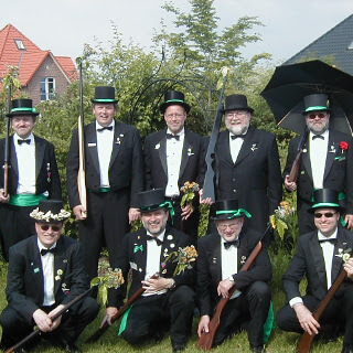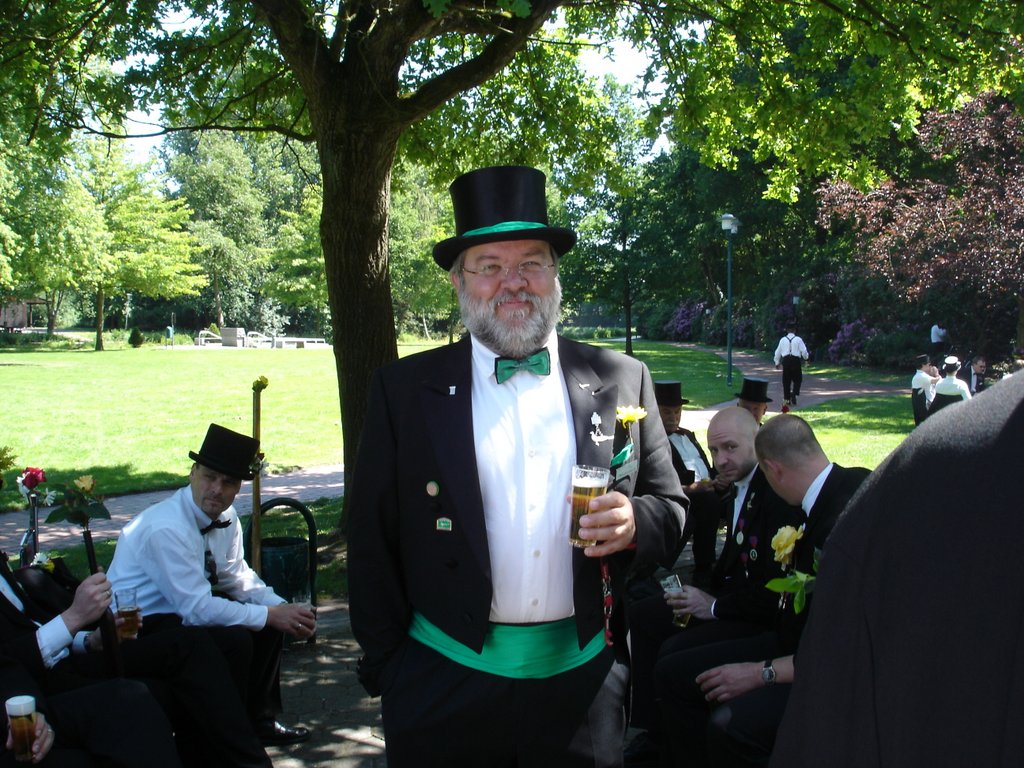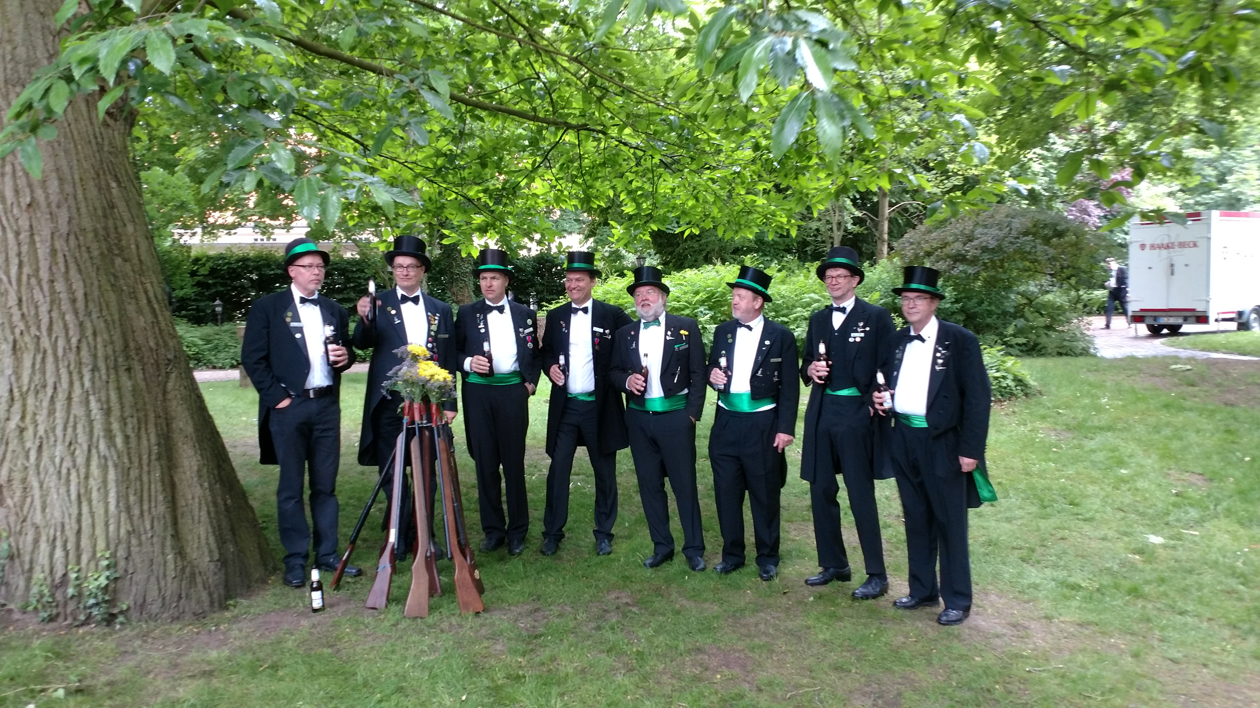 Ursprünglich sind wir eine Gruppe Gildemitglieder aus dem Kreishaus des Landkreises Oldenburg in Wildeshausen, die sich zusammengeschlossen haben, um am Pfingstdienstag mit der Kompanie auszumarschieren. Unser Erkennungszeichen ist das grüne Band am Zylinder.