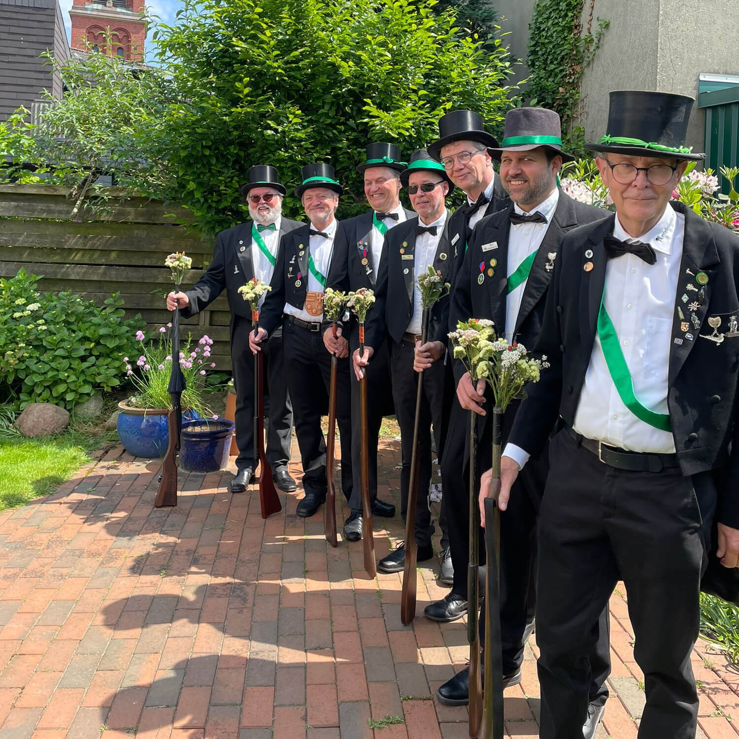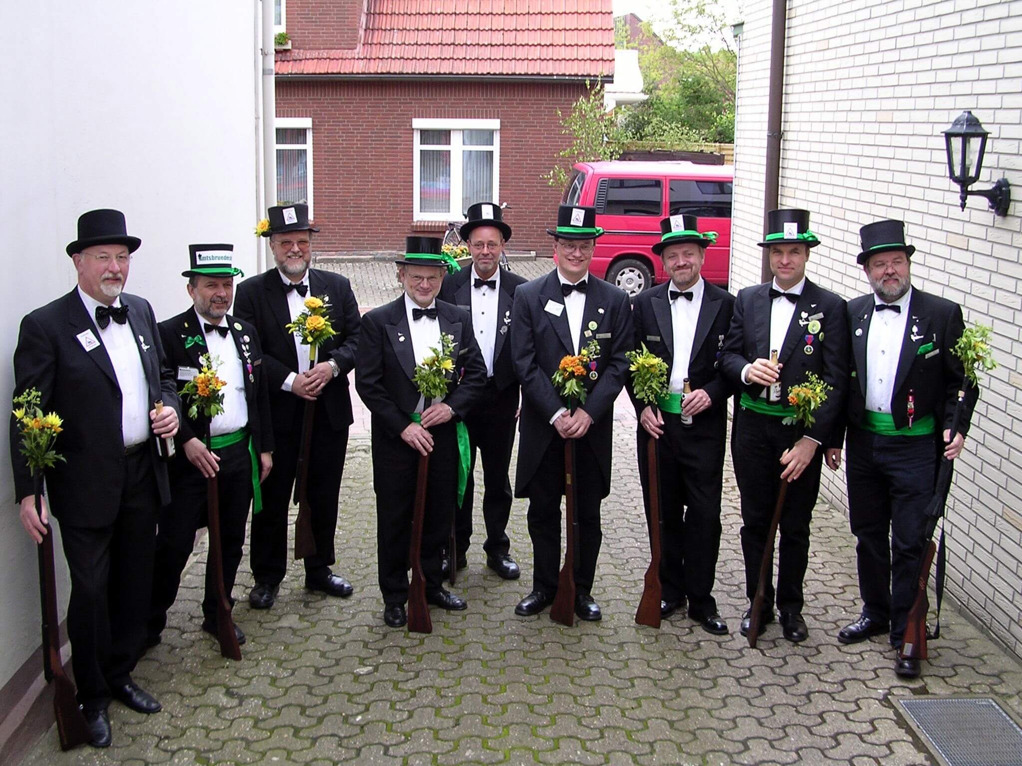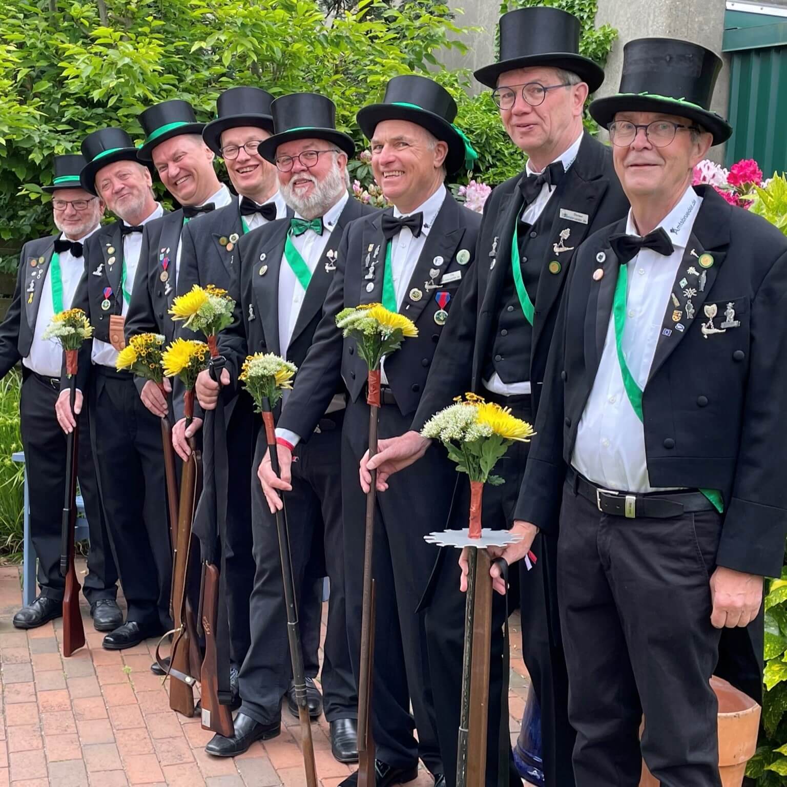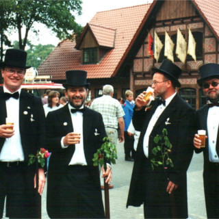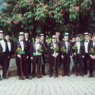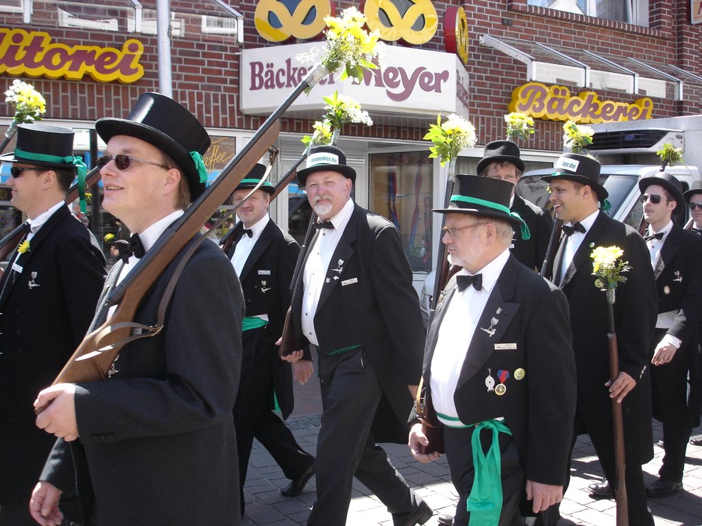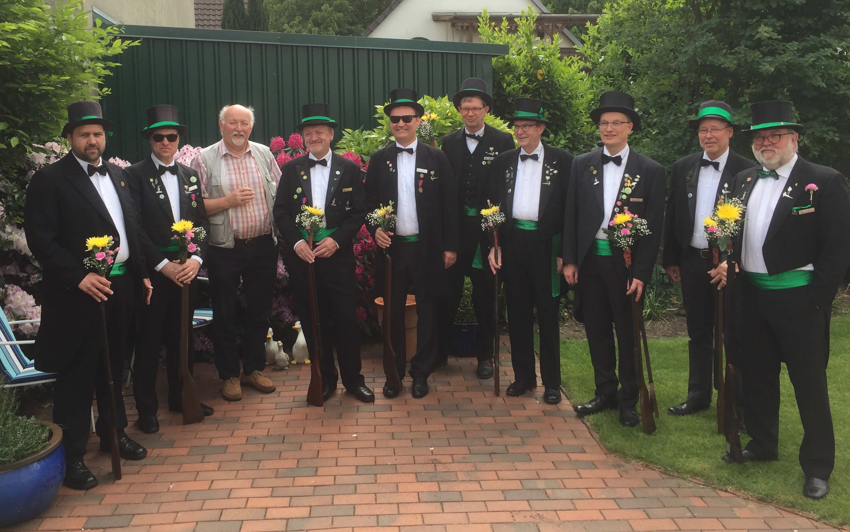 Ursprünglich sind wir eine Gruppe Gildemitglieder aus dem Kreishaus des Landkreises Oldenburg in Wildeshausen, die sich zusammengeschlossen haben, um am Pfingstdienstag mit der Kompanie auszumarschieren. Unser Erkennungszeichen ist das grüne Band am Zylinder.