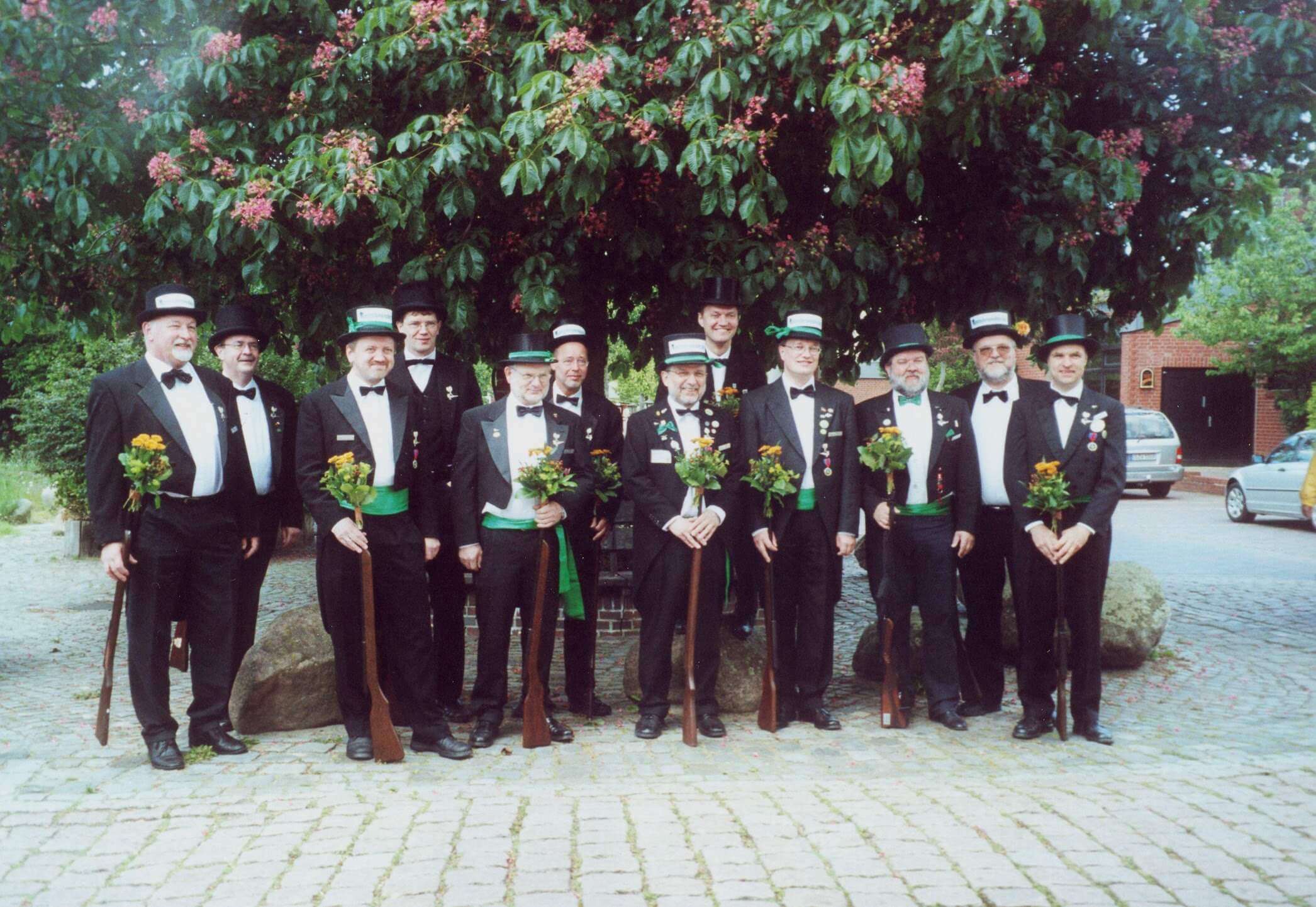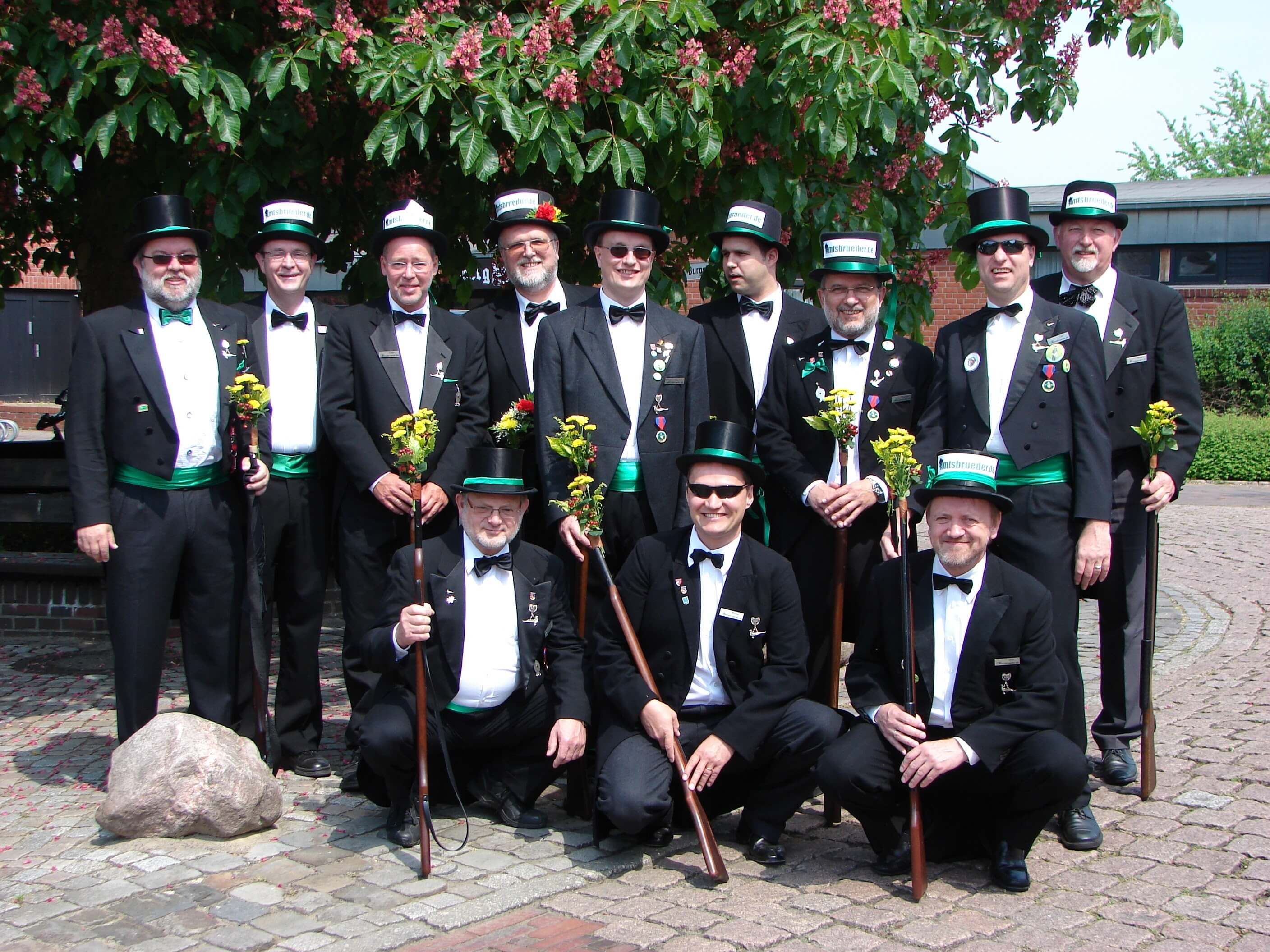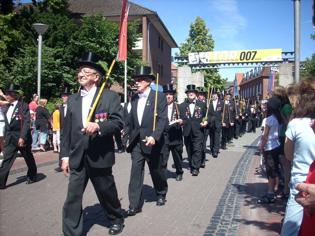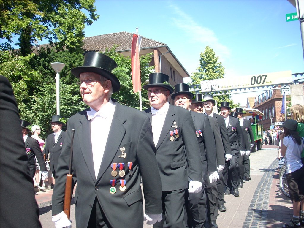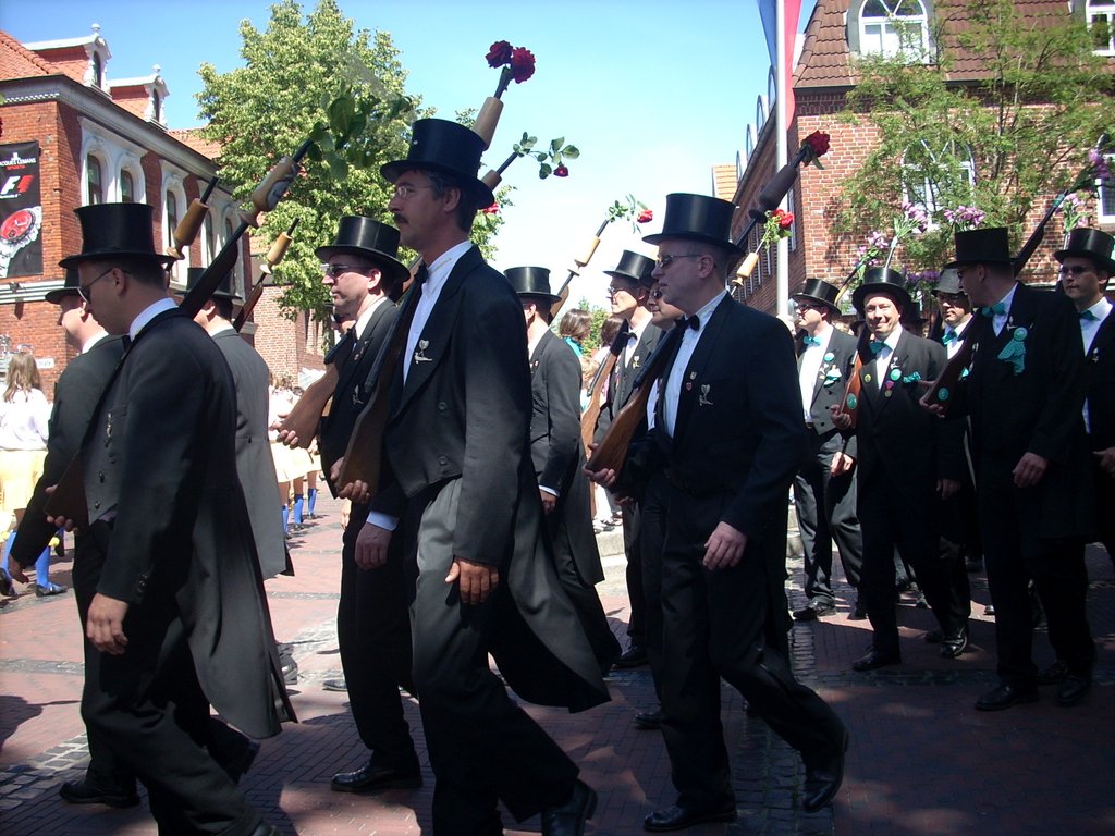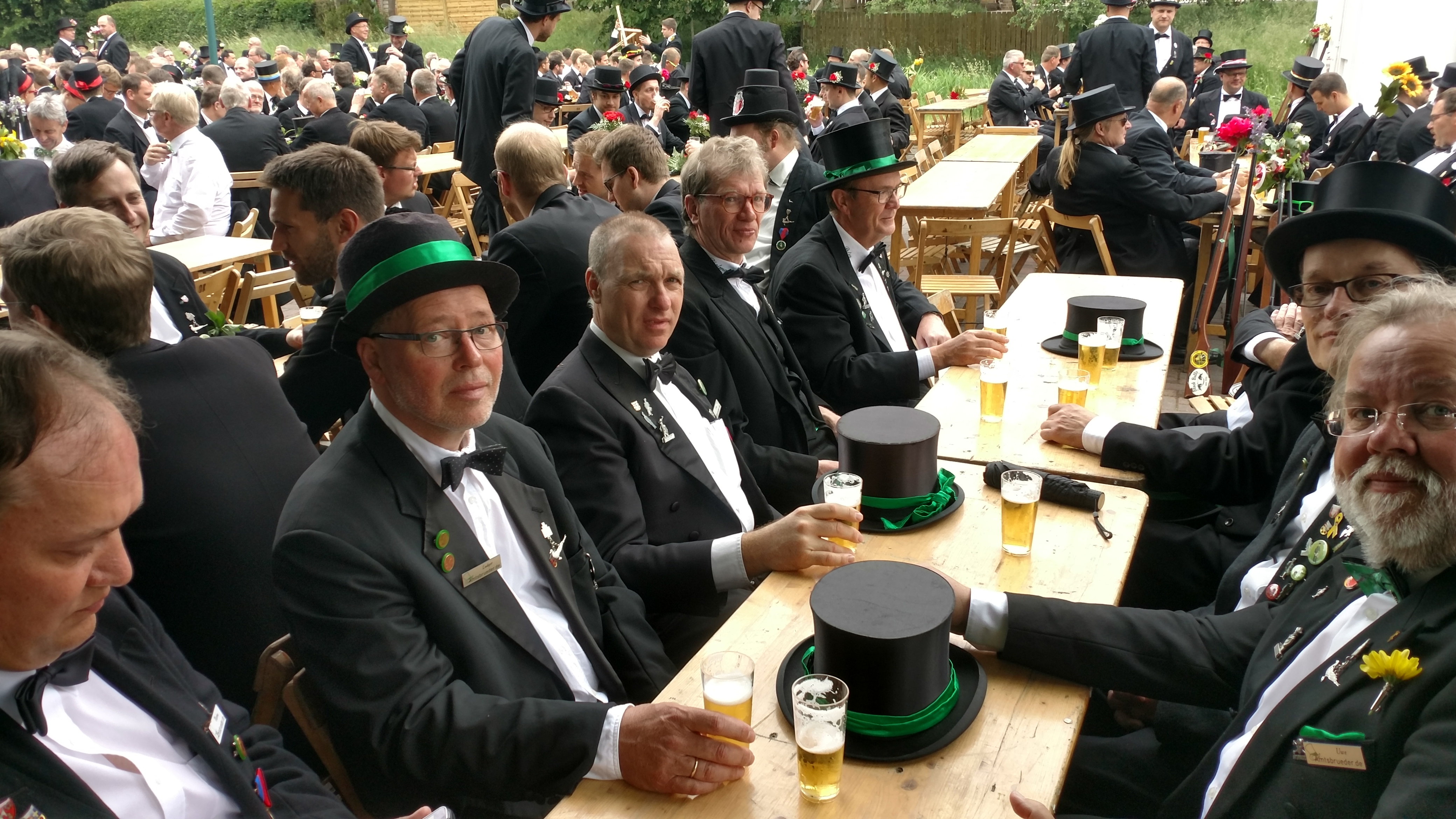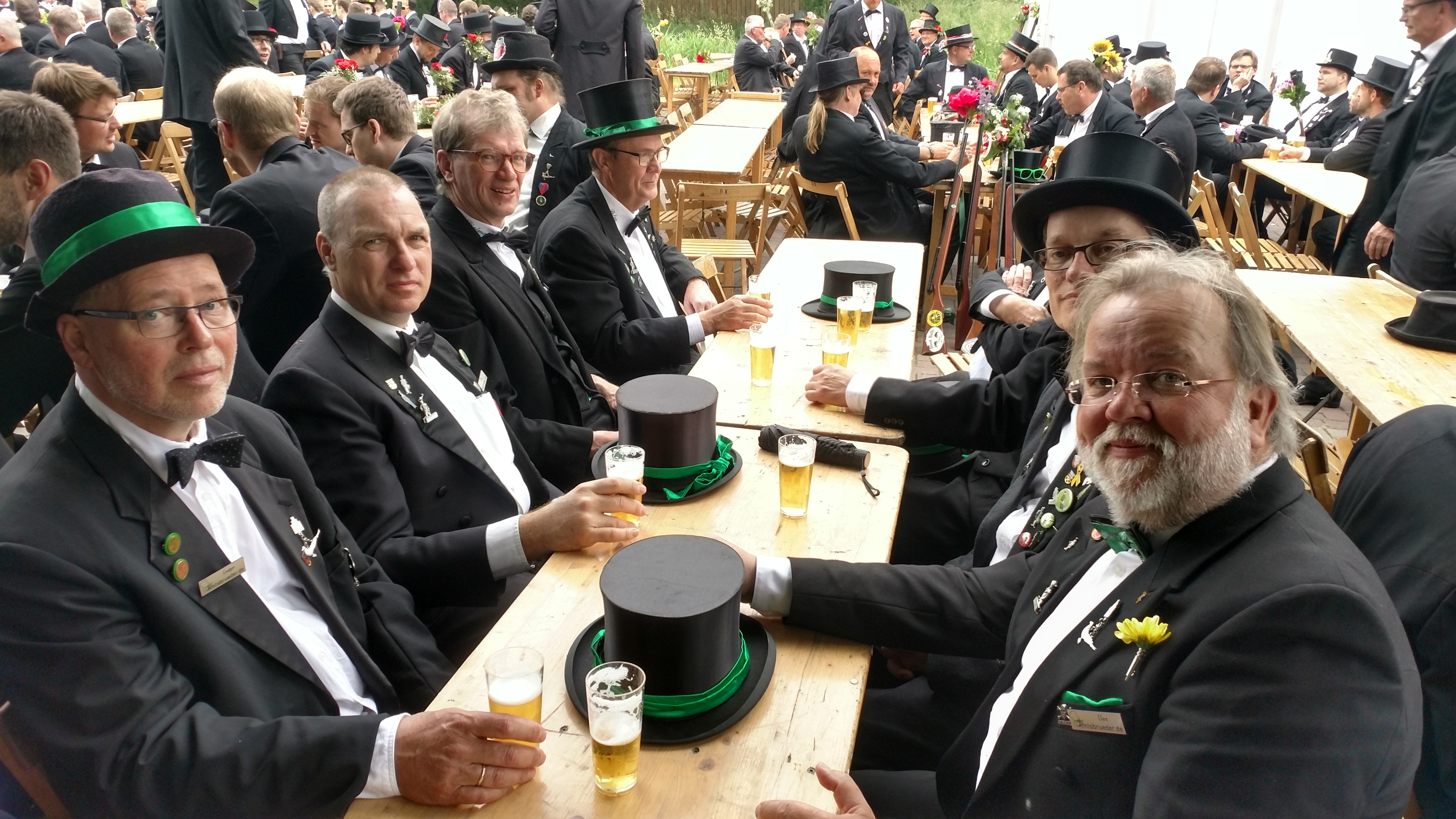 Ursprünglich sind wir eine Gruppe Gildemitglieder aus dem Kreishaus des Landkreises Oldenburg in Wildeshausen, die sich zusammengeschlossen haben, um am Pfingstdienstag mit der Kompanie auszumarschieren. Unser Erkennungszeichen ist das grüne Band am Zylinder.