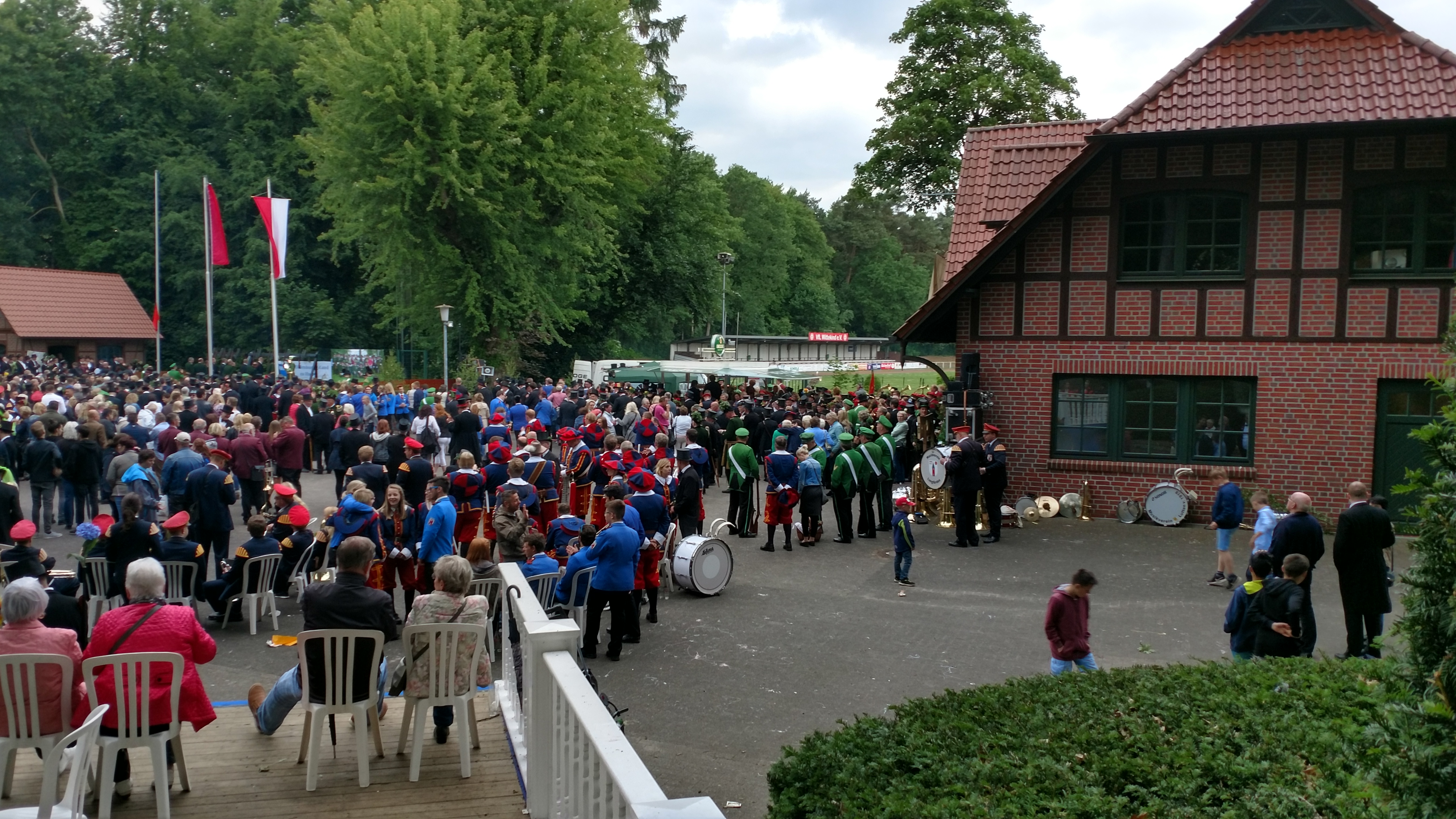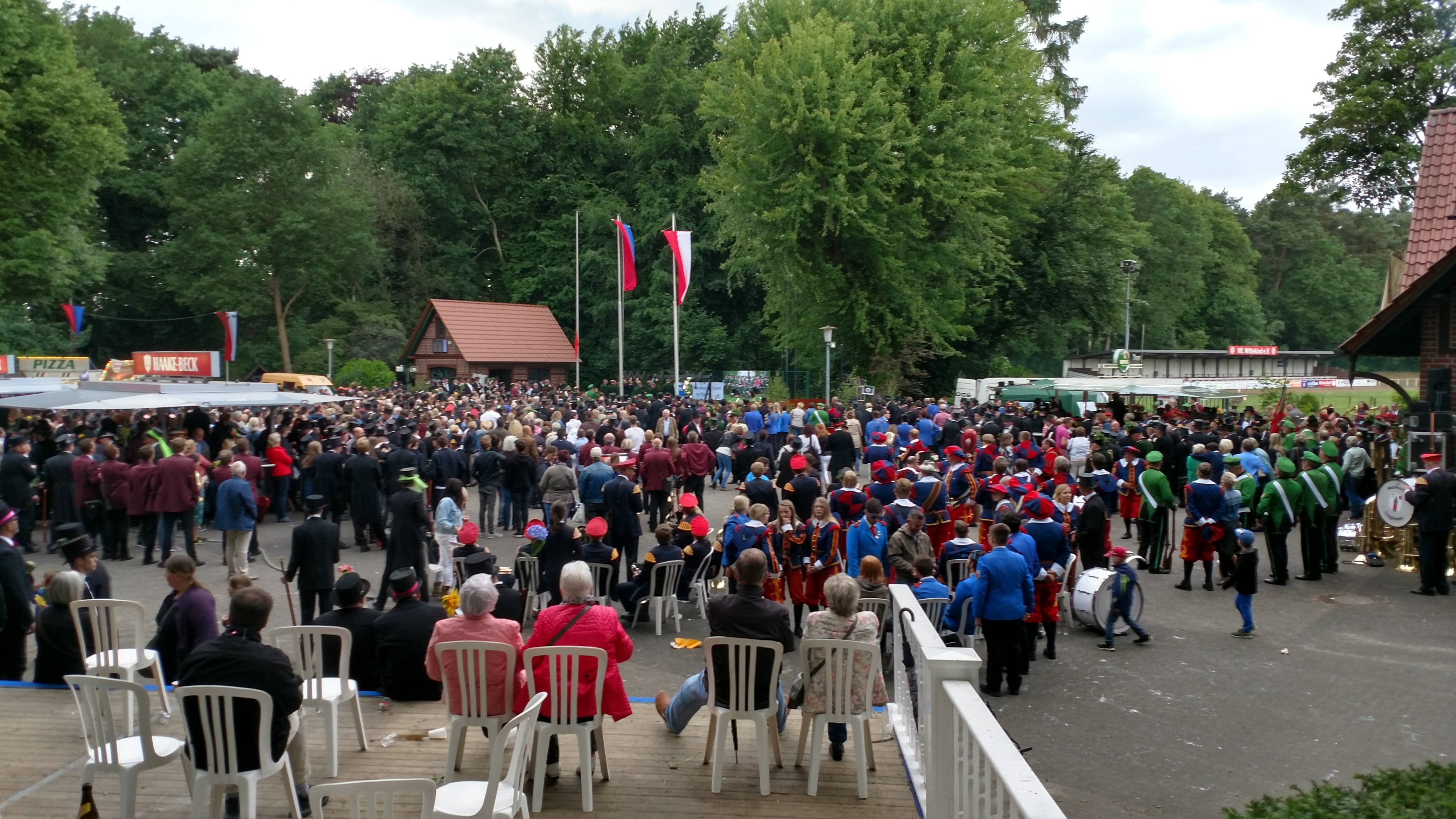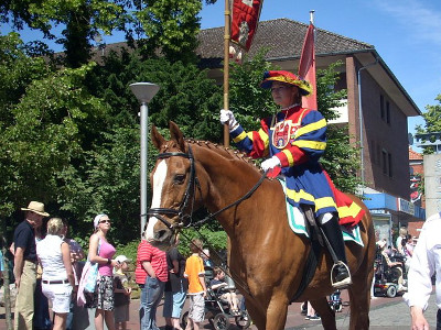 Dabei weht ein erfrischender Wind und es sind angenehme 22°. Zuvor hatten 80 neue Rekruten der Wildeshauser Schützengilde ihre Treue gelobt. Für Ahlrich Strathmann war es das letzte Gildefest als Hauptmann der Wache. Volker Pickart ist der neue König und Jörg Kramer der neue Schaffer.